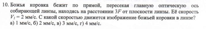 Растояние от коровки до фокуса равно 2F, от фокуса до линзы 1F, значит соотношение скоростей коровки и её изображения на линзе равно 2F/1F=2, то есть её скорость в два раза выше скорости её изображения.