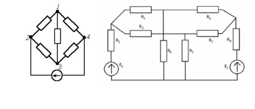 Найдите количество узлов, ветвей и контуров в цепи на рисунке. , Какое минимальное количество законов Кирхгофа надо записать, чтобы успешно рассчитать данную цепь?