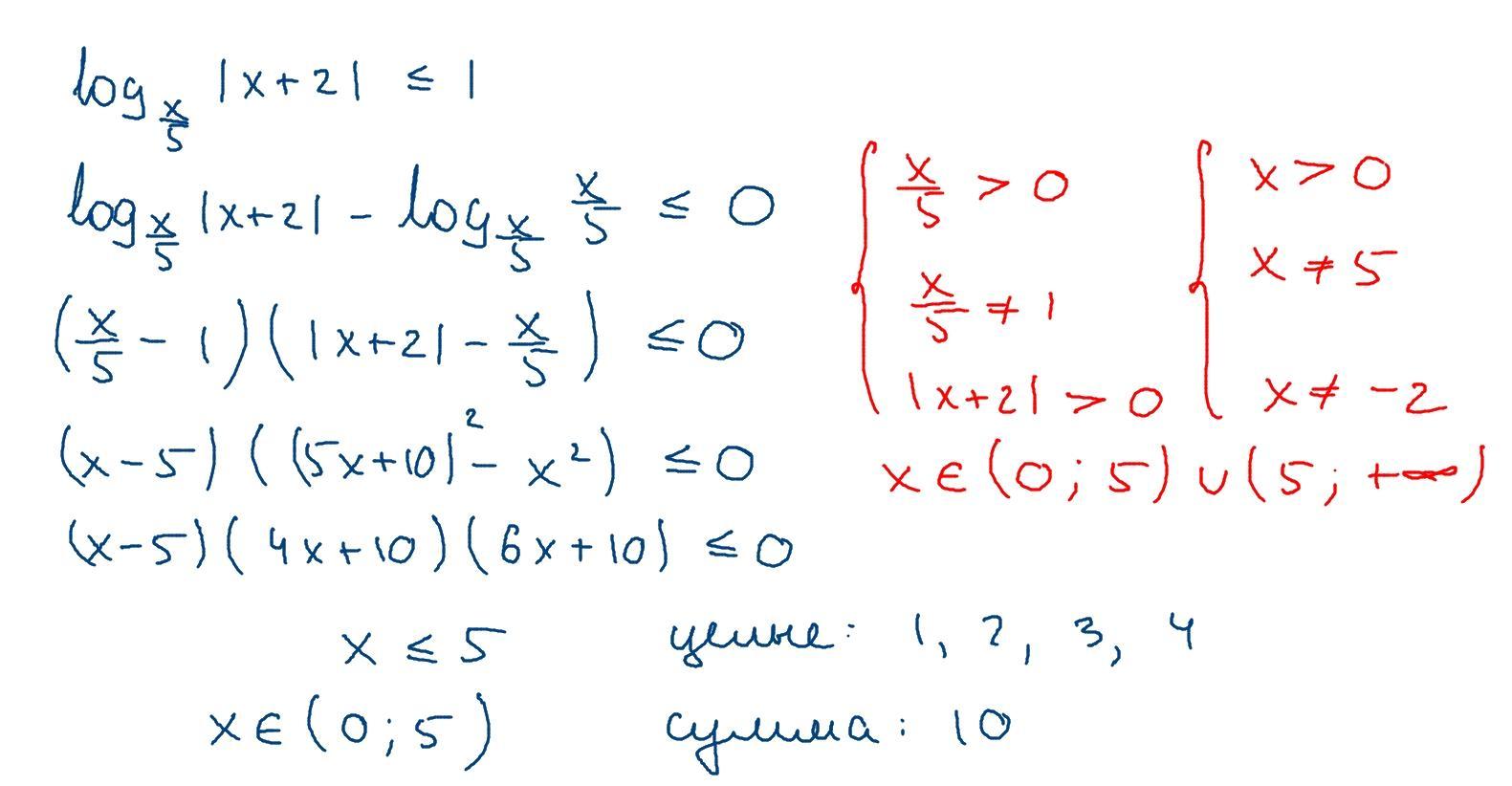 (0;5) , в этом интервале целыми решениями будут 1;2;3;4, а их сумма равна 1+2+3+4=10