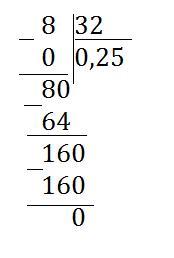 Решение: 8 на 32 не делится, в ответ пишем "0," и приписываем "0" к восьмерке.