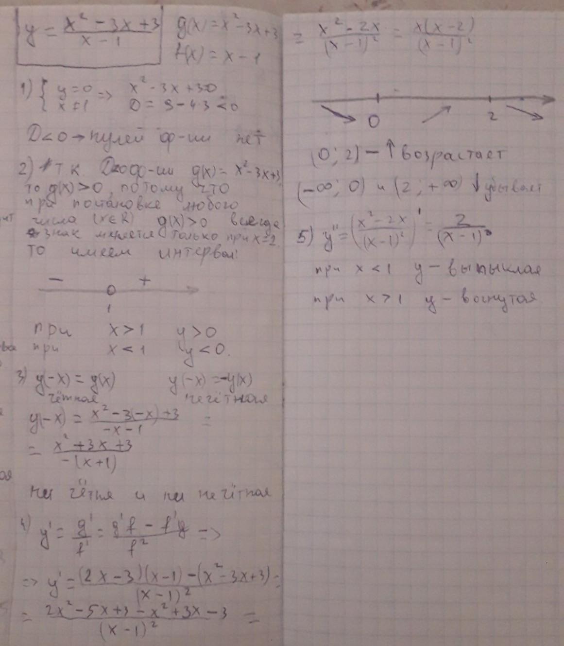 Нужно сделать исследование функции и обьяснить решение пунктов: 1)Найти нули функции; 2) Промежутки знакопостоянства функции; 3)Четность нечетность асимптот функции; 4)Промежутки возрастания и убывания функции; 5) Выпуклость впуклость функции.