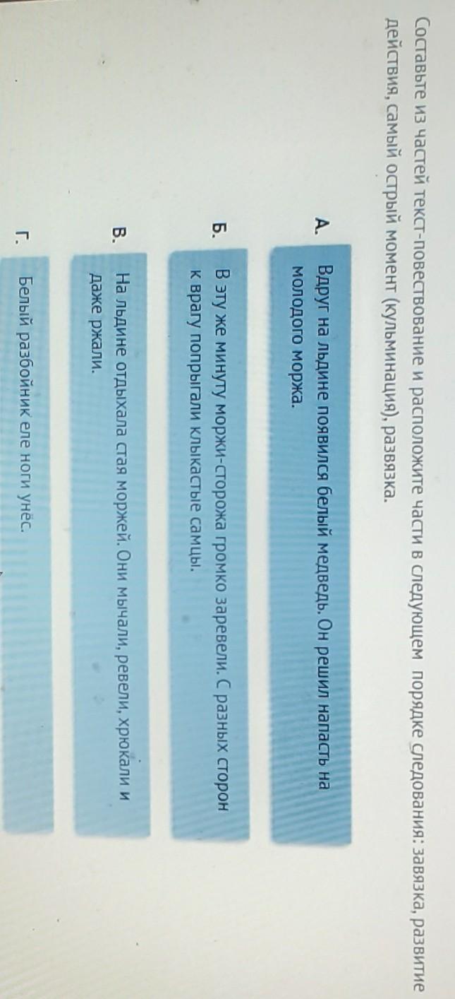 Чтобы получился текст-повествование, нужно поставить части в следующем порядке: В, А, Б, Г.