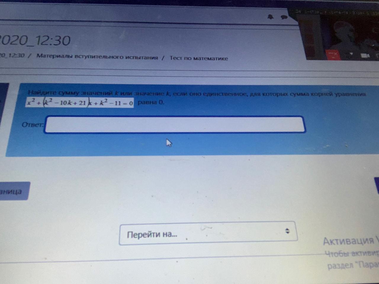 Сумма корней данного кв.уравнения равна нулю, если –(k²–10k+21)=0. => k=3 или k=7. 7 не подходит, т.к. в таком случае уравнение не будет иметь решений. Остаётся 3. Ответ k=3.