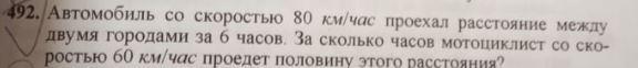 1) 80*6=480 (км) - расстояние между городами. 2) 480:2=240 (км) - половина расстояния. 3) 240:60=4 (ч) - за такое время мотоциклист проезжает половину расстояния между городами.