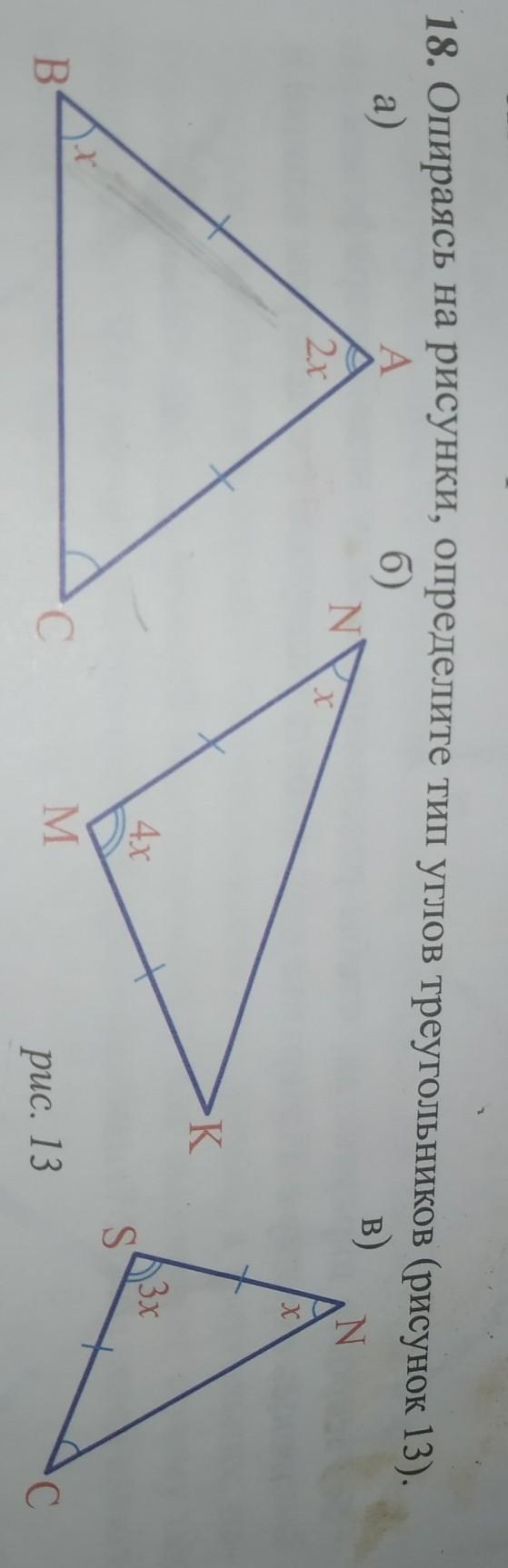 Пошаговое объяснение:Ри. а)в равнобедренном треугольнике углы при основании равны х, а при вершине 2х, сумма их равна 180°; х+х+2х=180; х=45, значит, два по 45°, третий 90°, треугольник прямоугольный. Два угла острых один; прямой.