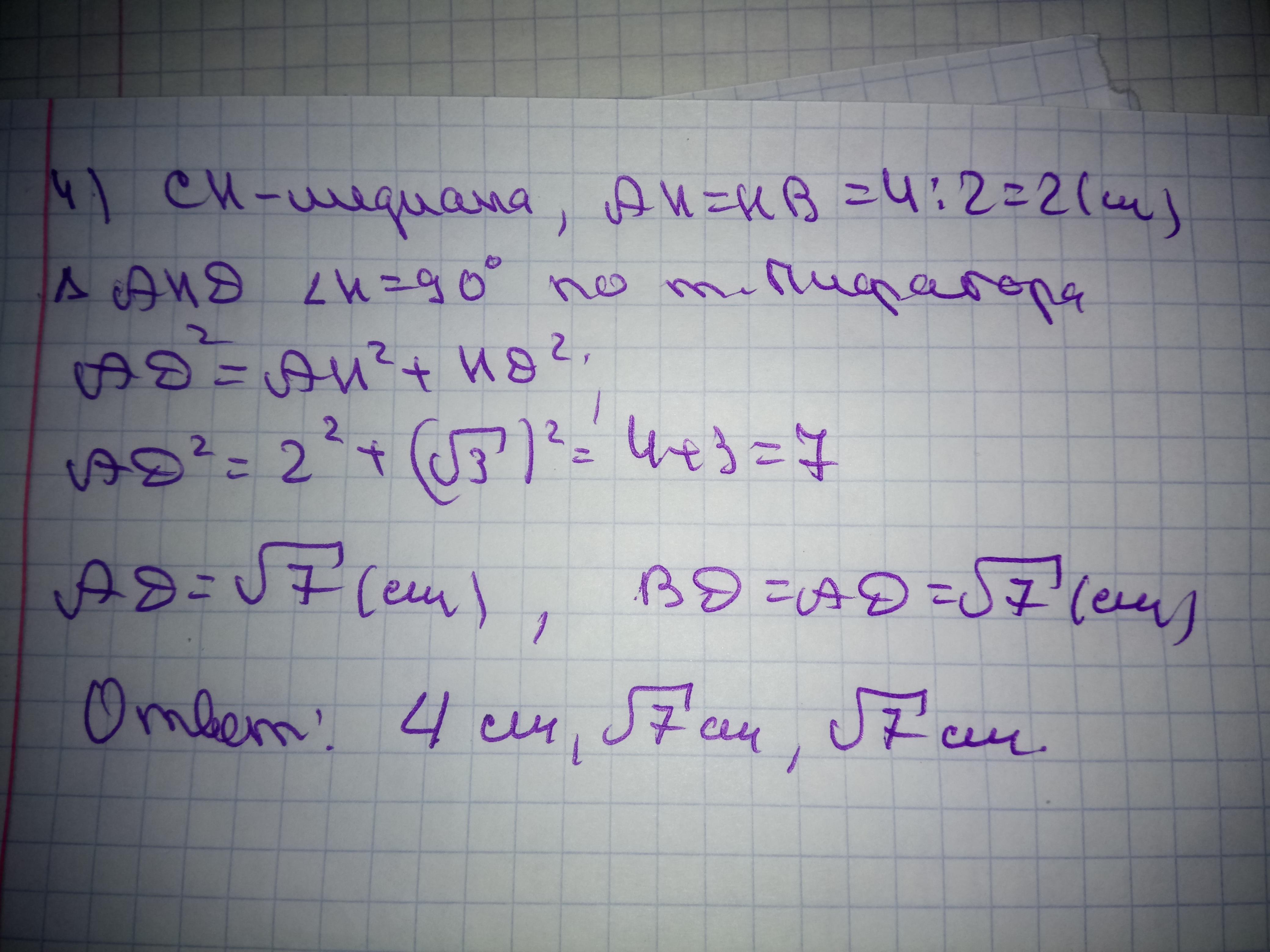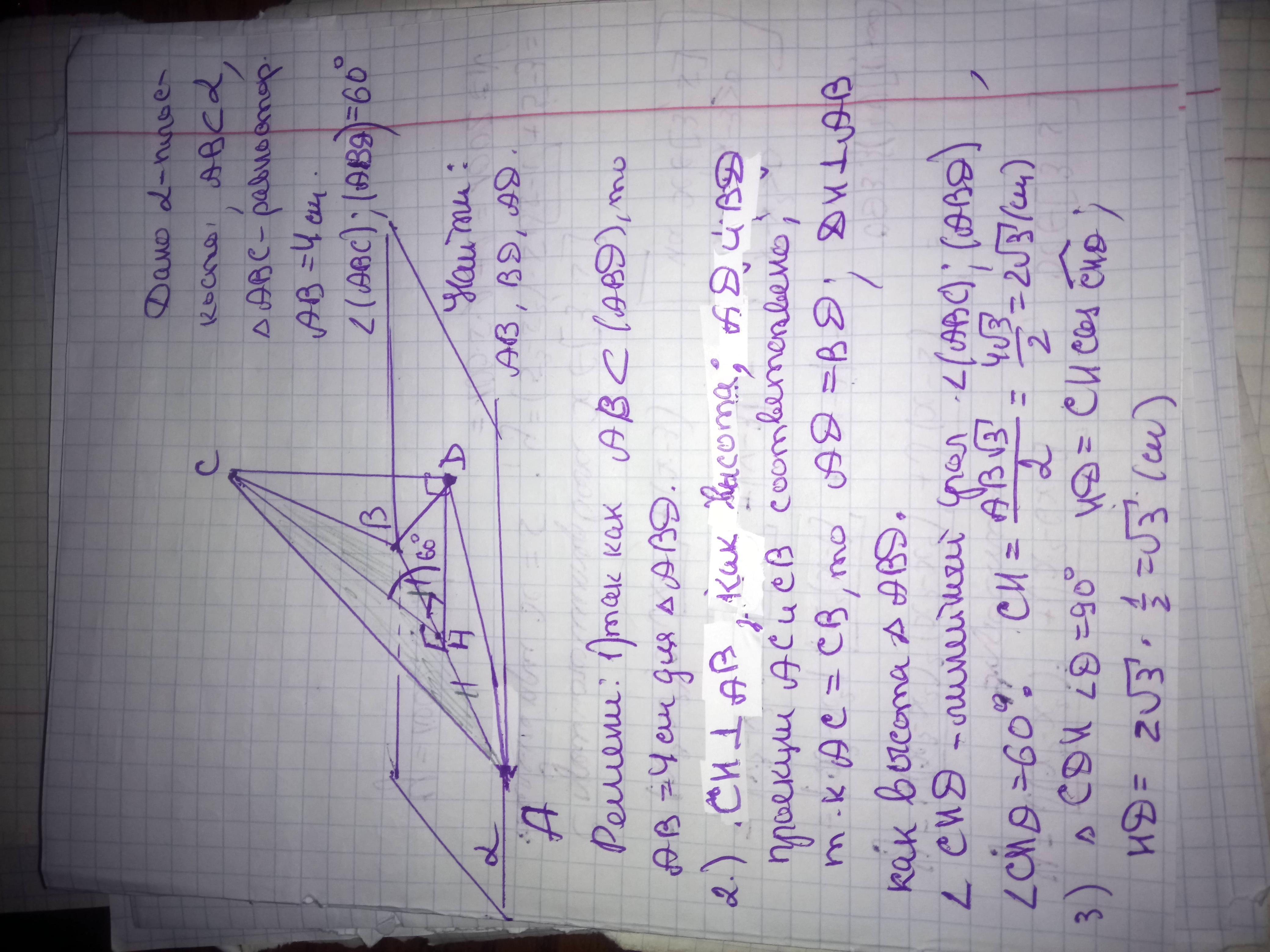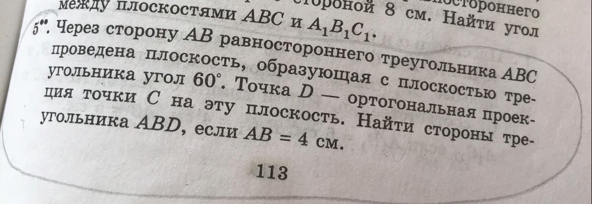 Через строну АВ равностороннего треугольника АВС проведена плоскость ,образующая с плоскостью треугольника угол 60. Точка Д-ортогональная проекция точки С на эту плоскость . Найти стороны треугольника АВД,если АВ=4 см.?