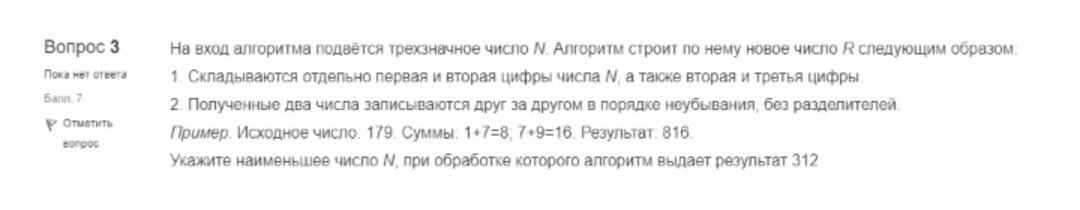 Идём от обратного. Результат — 312. Число 31 не может быть суммой двух цифр, так как максимально возможная сумма двух цифр — 9*2=18. Значит 312 — это числа 3 и 12. Рассмотри число 3.