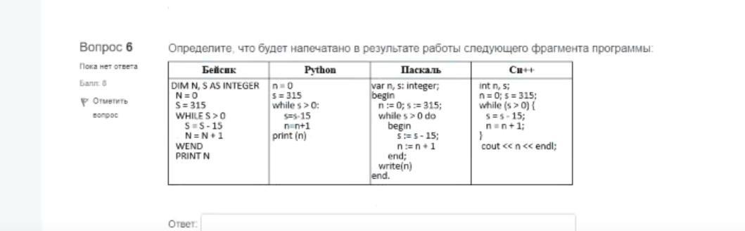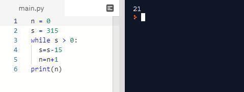 Дан цикл с предусловием ' s > 0 ', который будет с каждым проходом уменьшать s на 15, а n увеличивать на 1. 315/15 = 21 — через 21 проход s станет равна 0 и условие цикла не выполнится. n = 0 + 21 = 21.