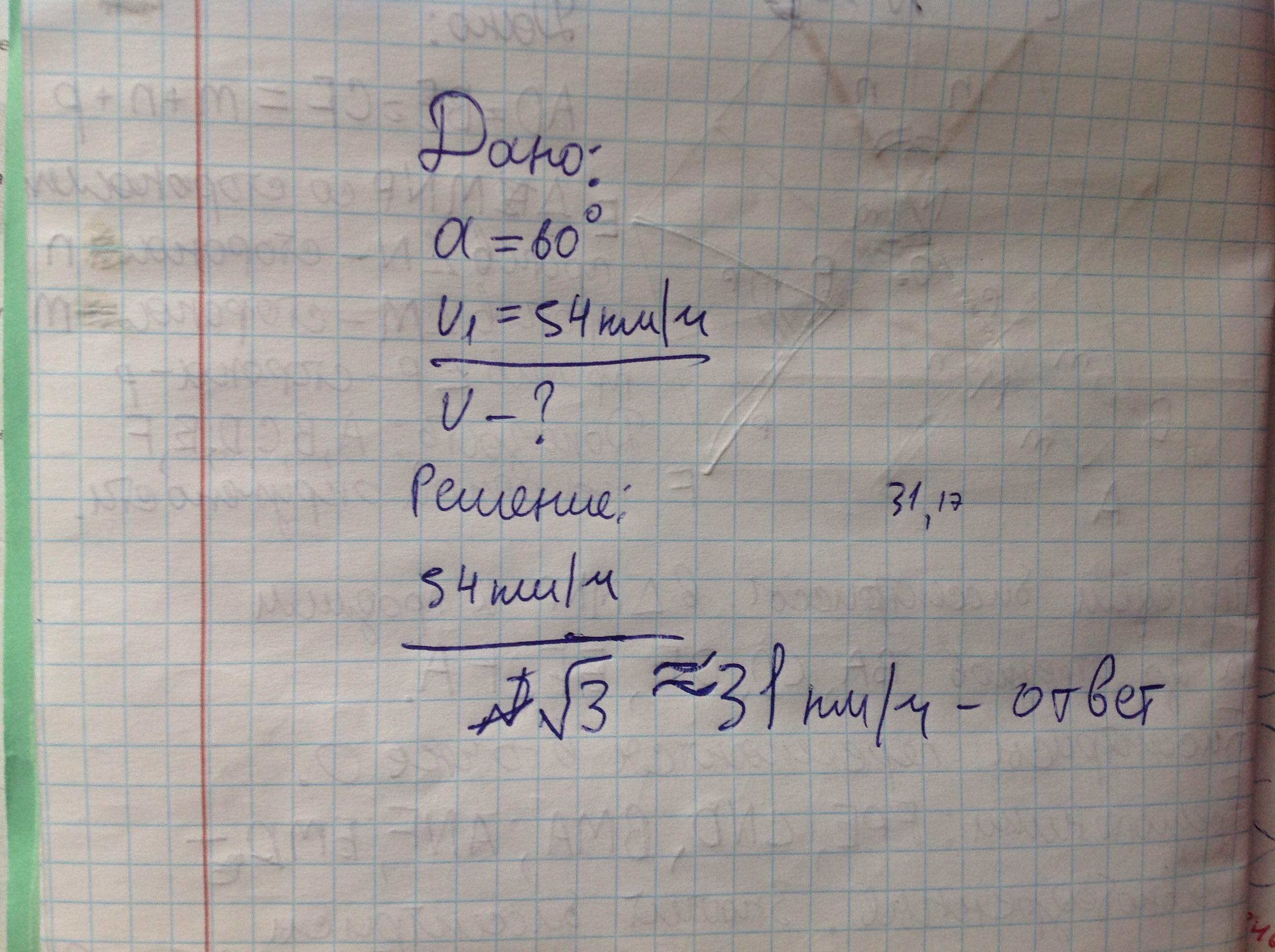 Дождевые капли текут под углом 60 градусов к вертикали по окну трамвая, движущегося со скоростью 54 км/ч. Какова скорость падения капель в воздухе, если ветра нет и они падают отвесно?