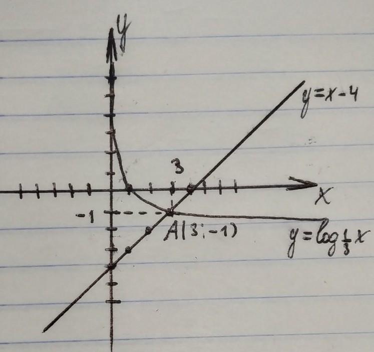 графіки функцій у=log1/3 x та у=х-4 перетинаються у точці А(3;-1) (див.рис) отже сума координат 3+(-1) =3-1 =2