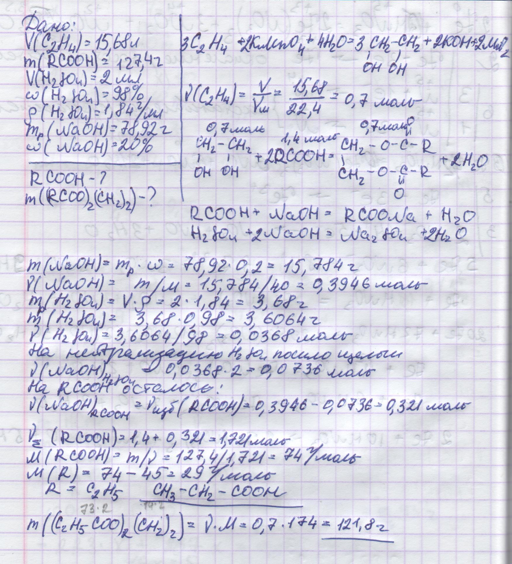 15,68 л этилена окислили холодным раствором перманганата калия. Органический продукт реакции нагрели с 127,4 г односновной карбоновой кислоты в присутствии 2мл 98%-го раствора серной кислоты плотность 1,84г/мл. По окончании реакции для нейтрализации полученной смеси израсходовали 78,92 г 20% -го раствора гидроксида натрия. Определите кислоту,взятую для этерификации, и массу полусенного эфира