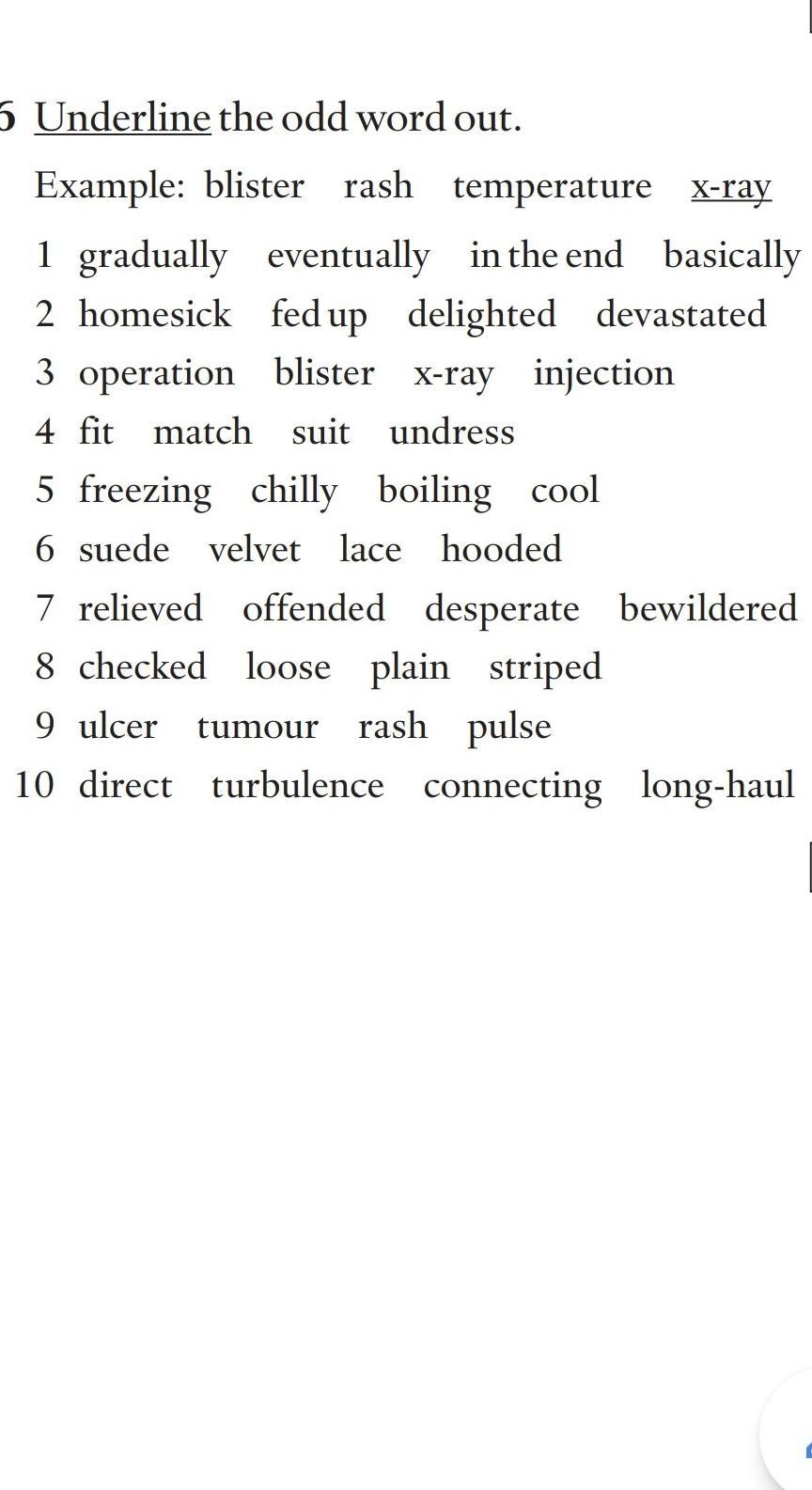 1. basically 2. homesick 3. blister 4. undress 5. boiling 6. hooded 7. relieved 8. plain 9.ulcer 10. turbulence