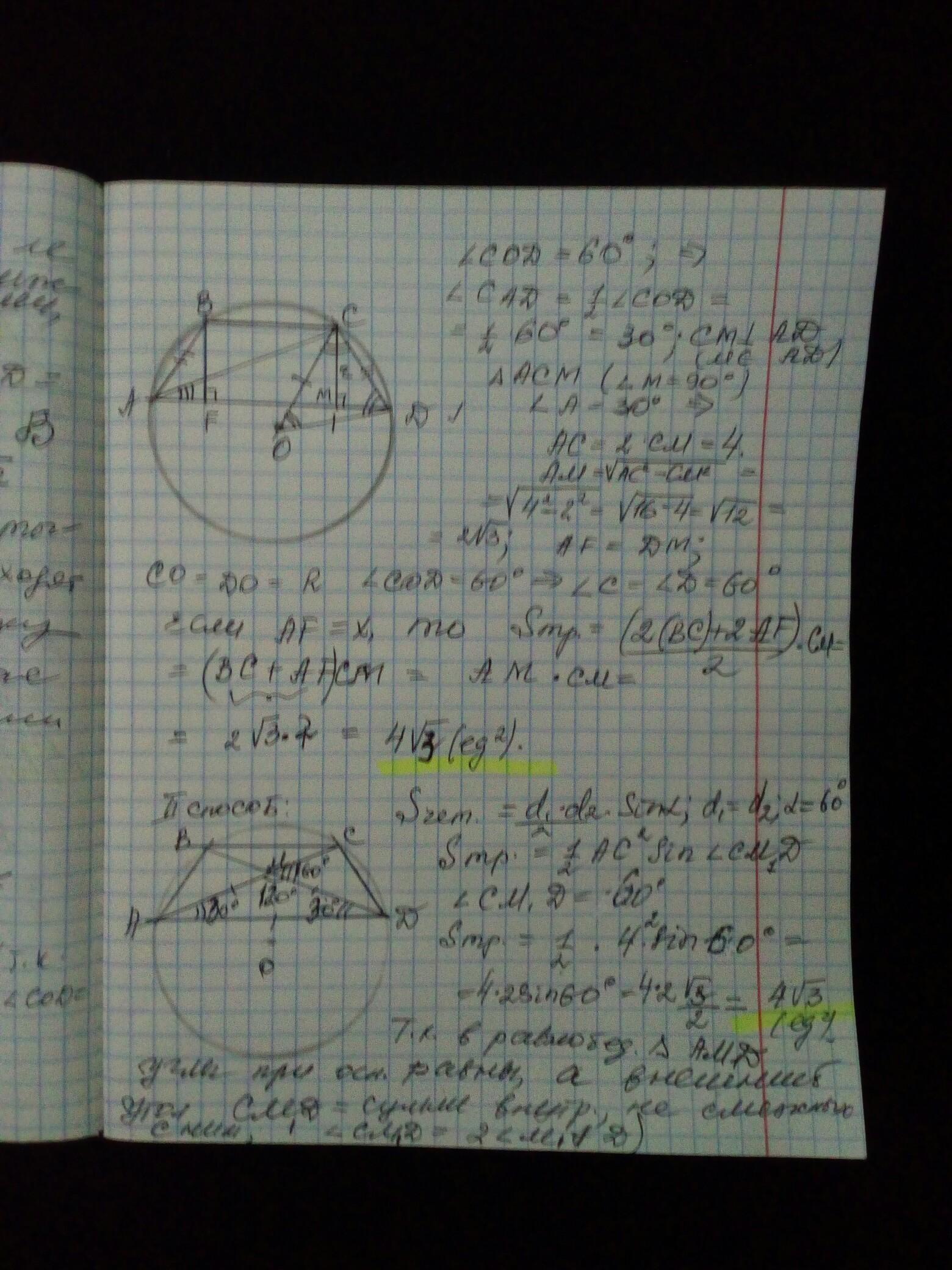 Найдите площадь трапеции ABCD BC || AD, вписанной в окружность с центром в точке O , если ее высота равна 2 , а угол COD равен 60.