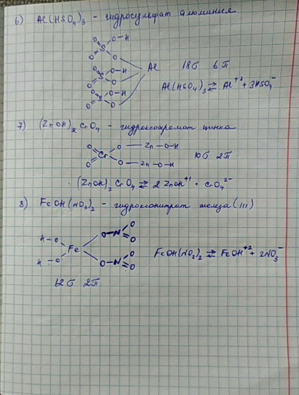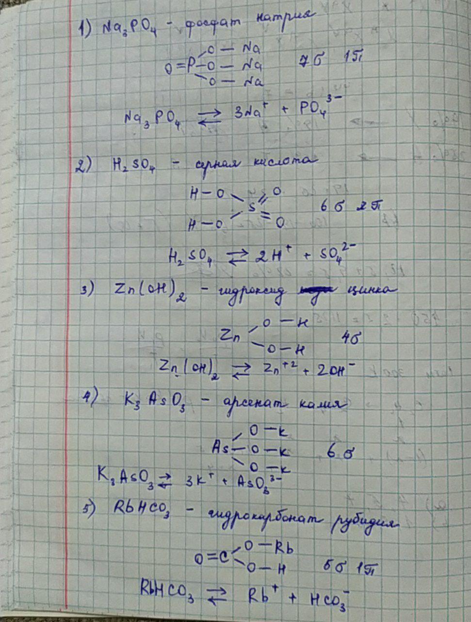 Назовите соединения, приведите их графические формулы и уравнения электролитической диссоциации. Na3PO4, H2SO4, Zn(OH)2, K3AsO3, RbHCO3, Al(HSO4)3, (ZnOH)2CrO4, FeOH(NO3)2.