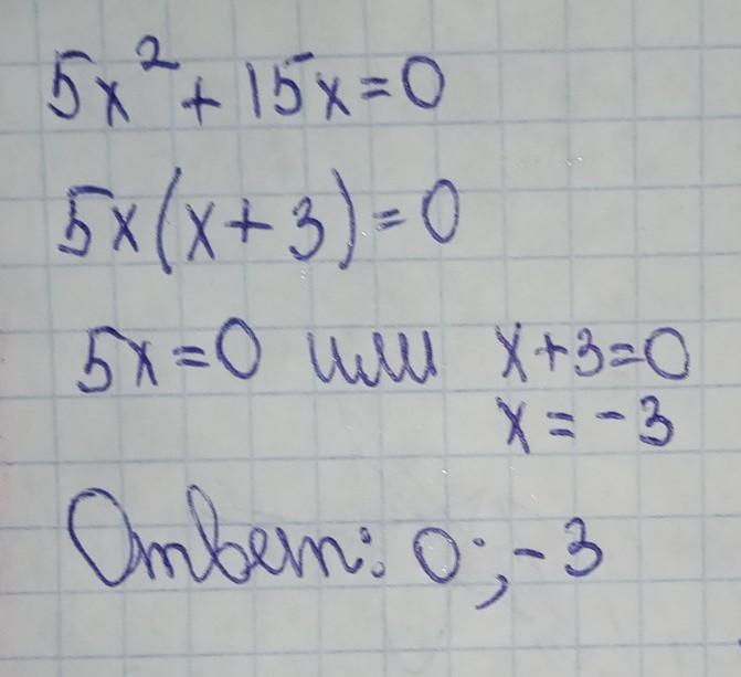 Ответ: 5*х*(х+3)=0 или х1=0, х2=-3 или. То есть имеем два корня корень х1=0, х2=-3.