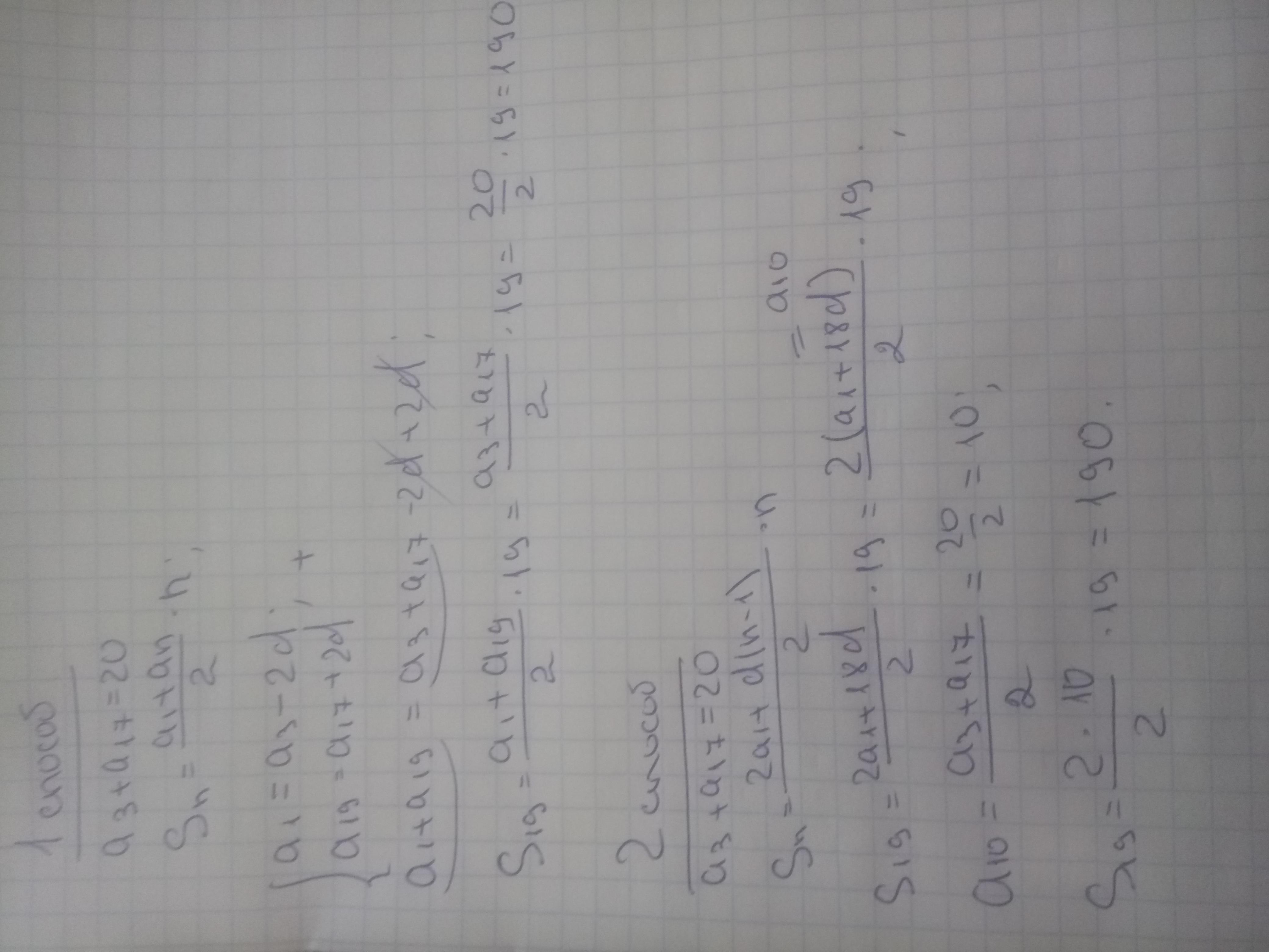 Ответ 190. 2 способа. Третий вам уже написали. Обратите внимание на первый. Используем характеристичнское свойство АП, отсюда а3+а17=а1+а19
