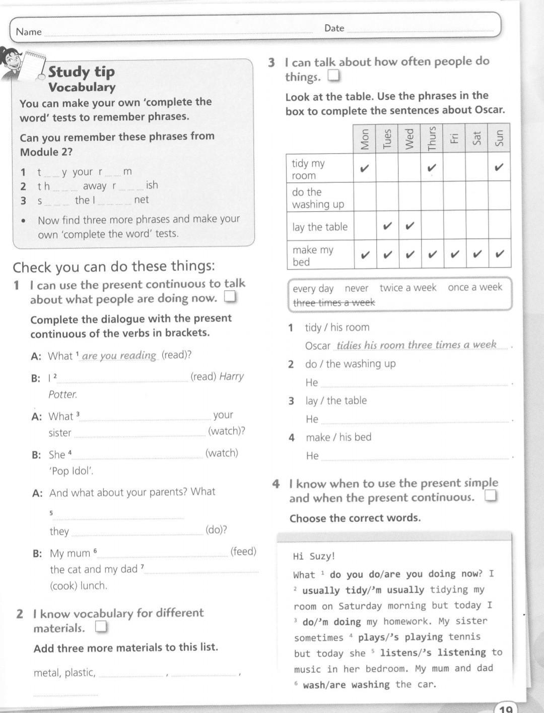 1 - are you going, 2 - I usually tidy, 3 - I’m doing, 4 - plays, 5 - is listening, 6 - are washing.