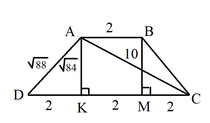 Опустим высоты АК и ВМ. Получим прямоугольник АКМВ по построению. Длина этого отрезка равна КМ+МС.