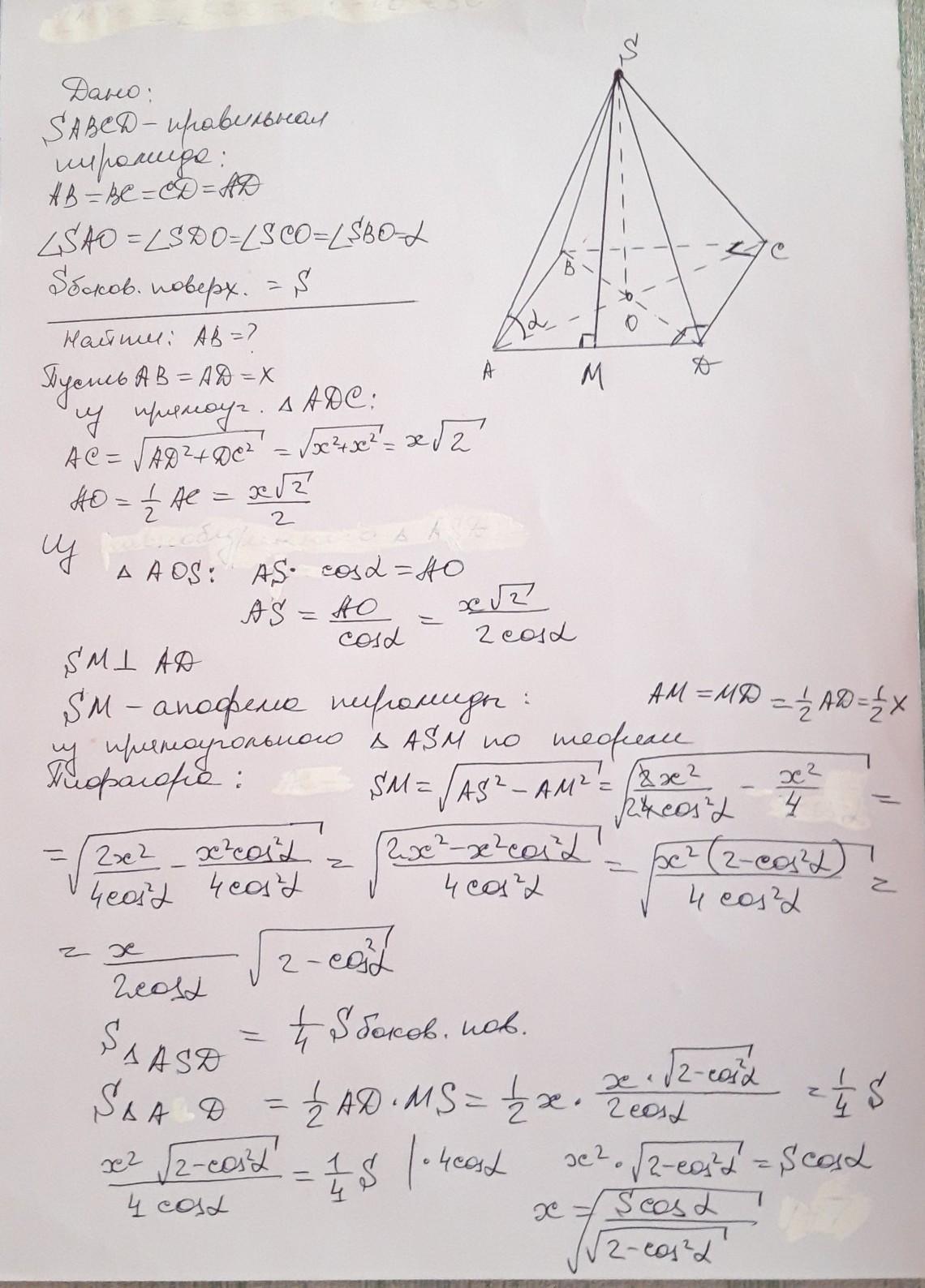 Боковая поверхность правильной четырехугольной пирамиды равна S , а угол между боковым ребром и плоскостью основания равен α . Найти сторону основания пирамиды.