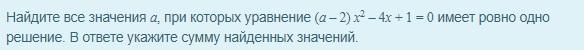 Рассмотрим случай, когда коэффициент при х² равен нулю. тогда уравнение превращается в линейное. 4х=1, корень его х=1/4, и случай, когда остается уравнение квадратным, т.е. а≠2, для этого найдем Дискриминант, он должен равняться нулю, тогда один корень у уравнения, точнее сказать, два, но одинаковых.