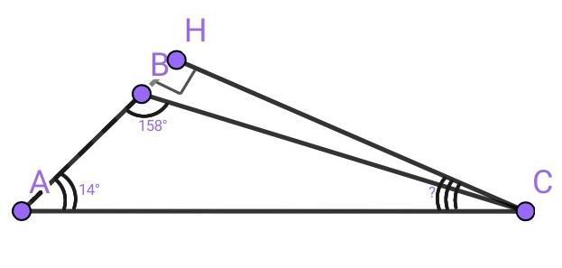 В треугольнике ABC угол B - тупой, CH - высота, угол ABC равен 158 градусов. Угол BAC равен 14 градусам. Найдите угол ACH. ответ дайте в градусах.