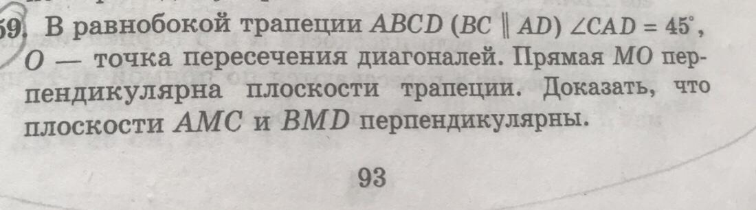 В равнобокий трапеции АВСД , О-точка пересечения диагоналей. Прямая МО перпендикулярна плоскости трапеции . Доказать , что плоскости АМС и ВМД перпендикулярны