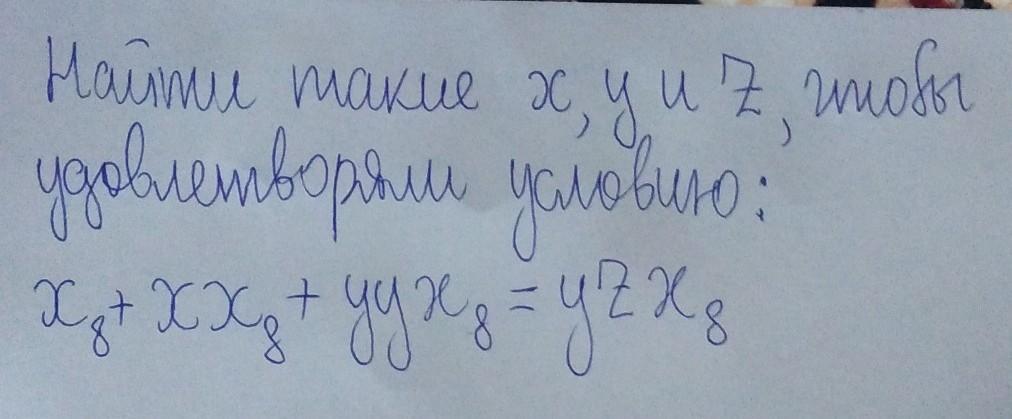 Так как числа представлены в восьмеричной системе счисления, x, y, z ≤ 7. Более того, в числах с количеством цифр больше одной цифры в старшем разряде ненулевые, то есть x, y ≥ 1. Переведём все числа в десятичную систему счисления: