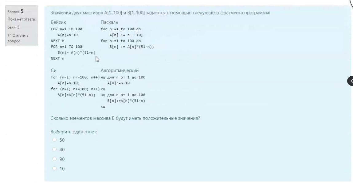 В массиве A первые 10 значений неположительны, а остальные 90 — положительны. В массиве B первые 51 значение — результат произведения соответствующего элемента массива A и положительного числа, а остальные 49 — результат произведения элемента массива A и неположительного числа.