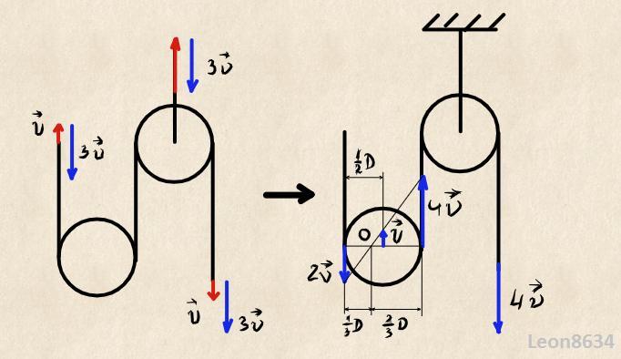 2) Более простой способ - скорость "втягивания" веревки 4v-2v=2v, а так как подвижный блок дает проигрыш в расстоянии в два раза, то и скорость его центра в два раза меньше скорости вытягивания веревки.