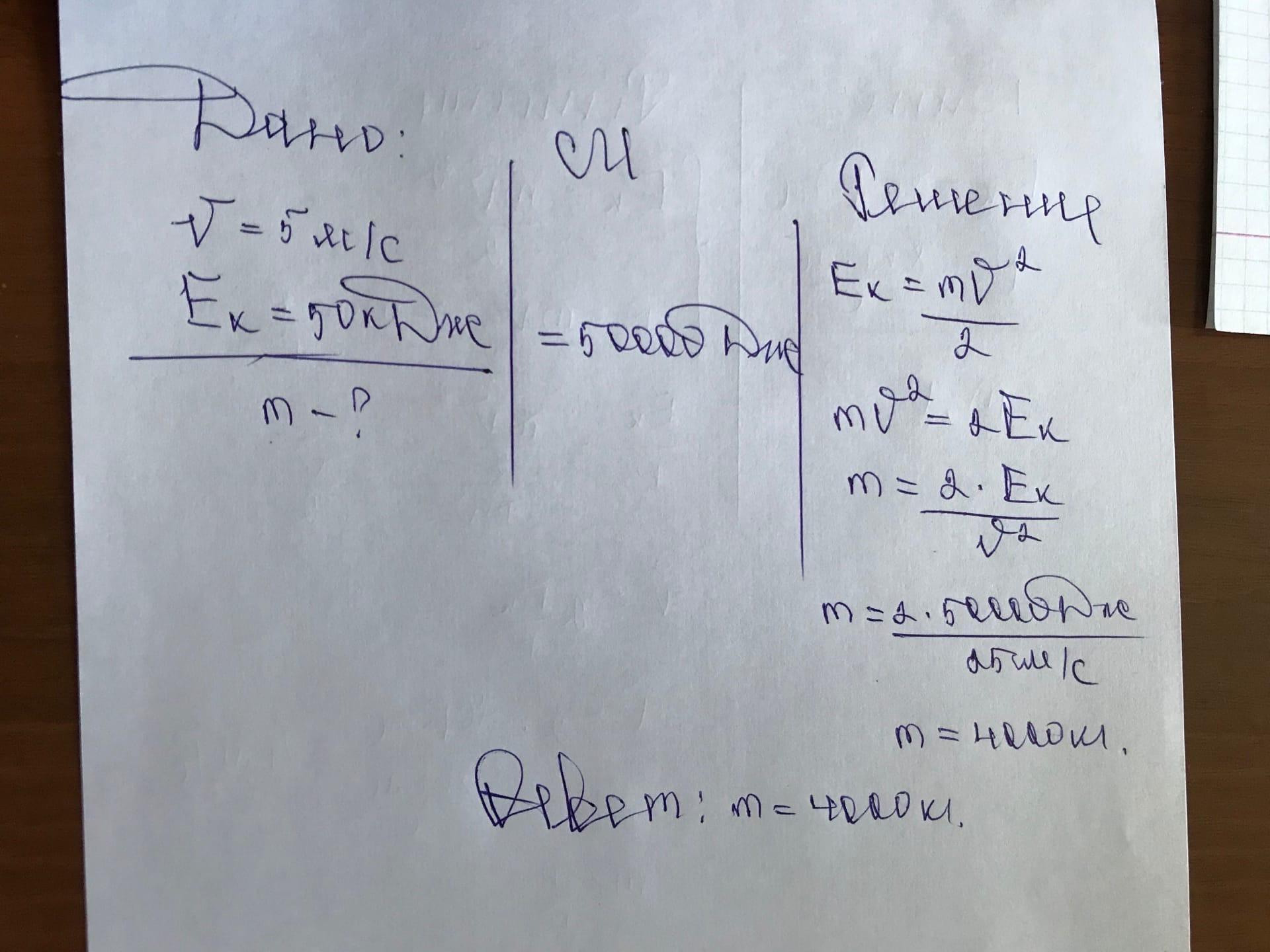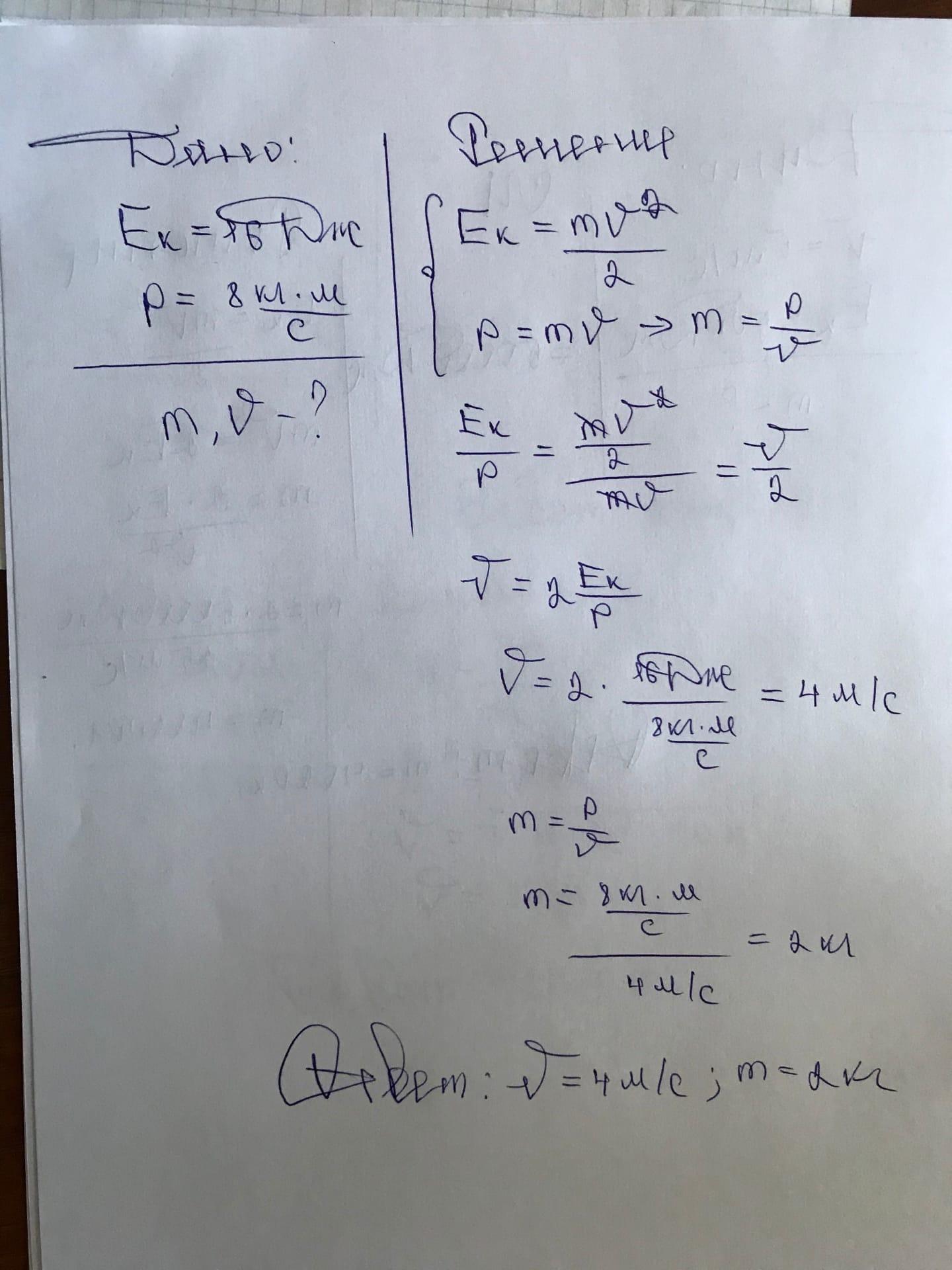 9 класс физика не удаляйте пж Импульс тела равен 8 кг*м/с, Ек=16Дж. Найти массу и скорость тела и ещё Найдите m тела которое двигаясь со скоростью 5 м/с обладает Ек=50кДж