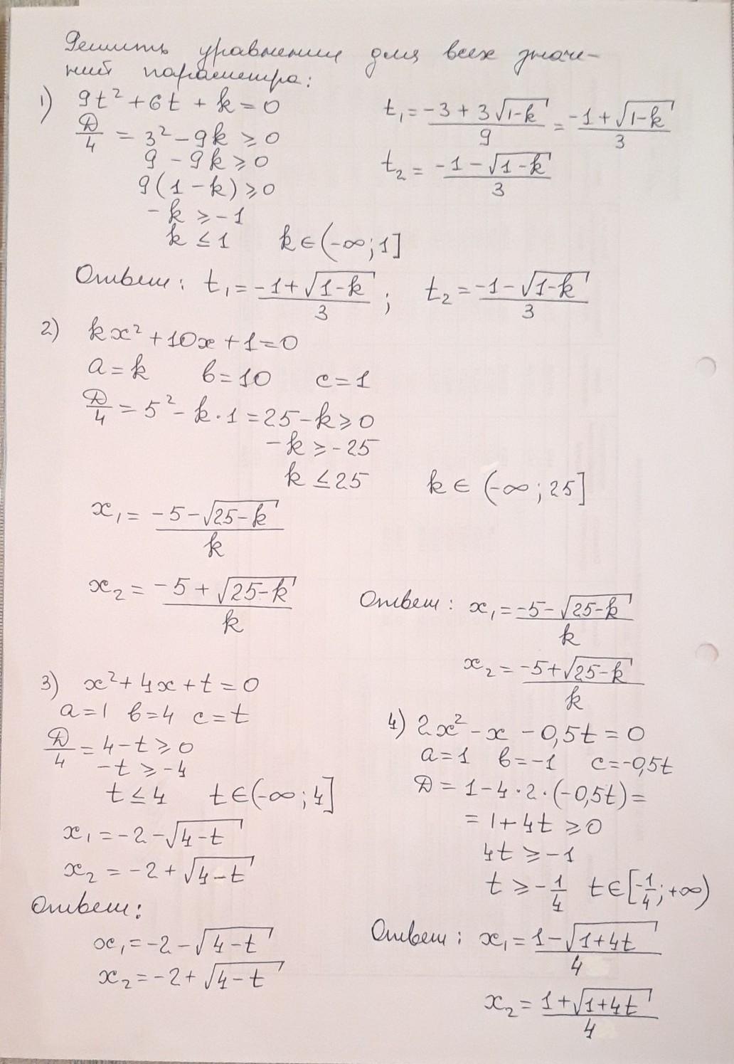 ПОМОГИТЕ РЕШИТЬ НЕСКОЛЬКО ПРИМЕРОВ!!!! Решить уравнения для всех значений параметра. 1. 9 t^2 + 6t + k = 0 2. kx^2 + 10x + 1 = 0 3. x^2 + 4x + t = 0 4. 2x^2 - x - 0,5t = 0