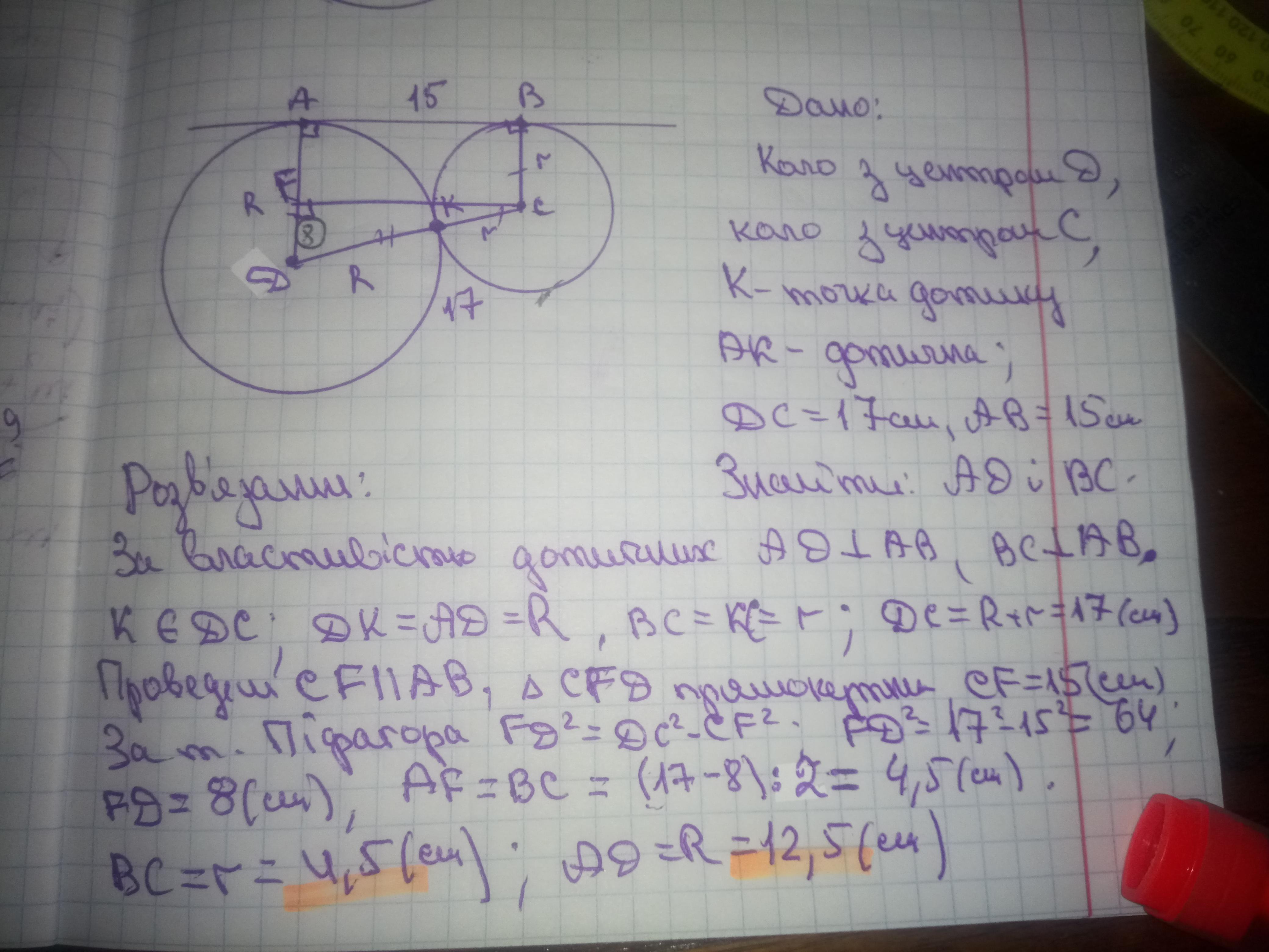 два кола, відстань між центрами яким дорівнює 17 см, мають зовнішній дотик. знайдіть радіуси цих кіл, якщо відстань між точками дотику кіл з їх спільною зовнішньою дотичною дорівнює 15 см.
