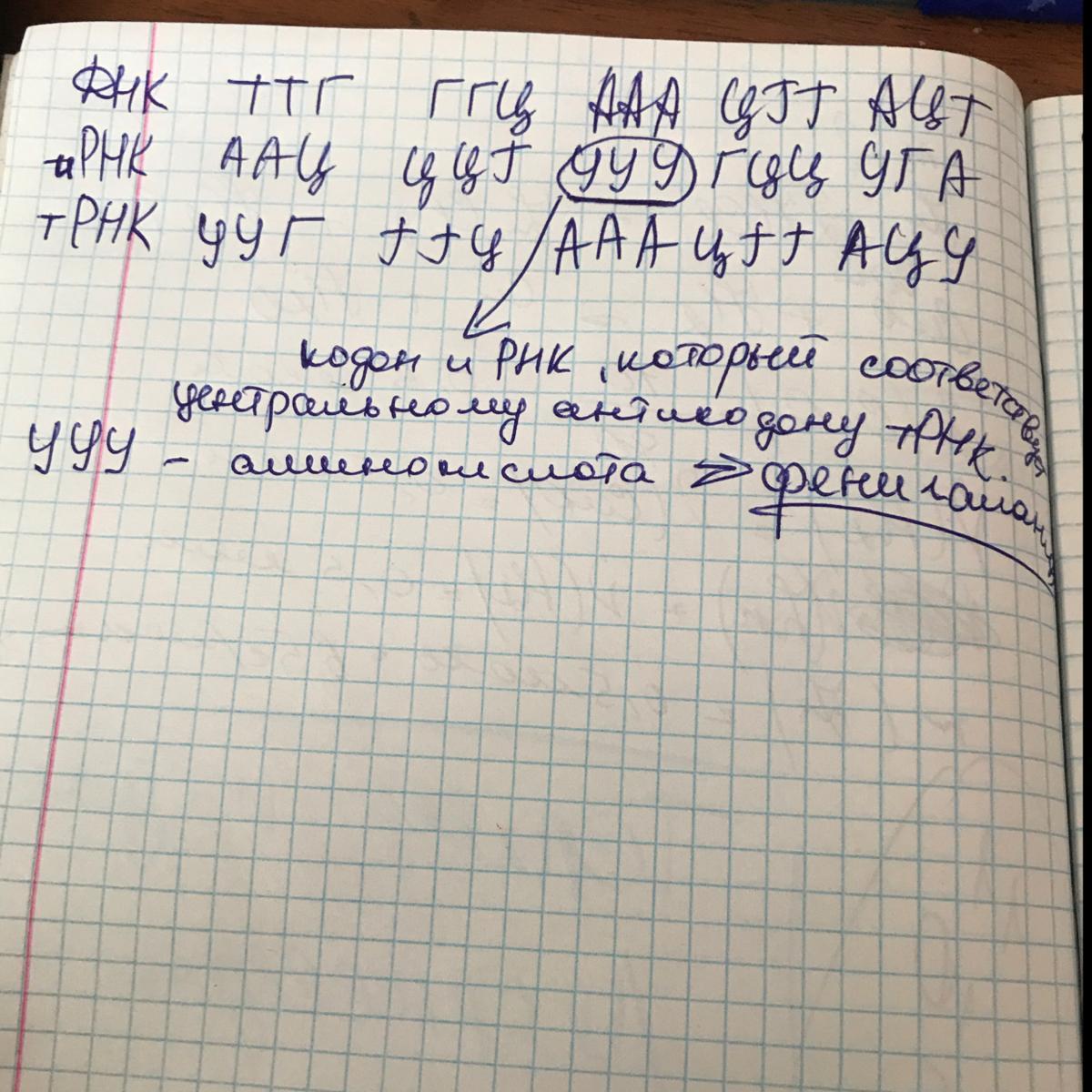 Известно, что все виды РНК синтезируются на ДНК-матрице. Фрагмент молекулы ДНК, на котором синтезируется участок тРНК, имеет следующую последовательность нуклеотидов ТТГ-ГГЦ-ААА-ЦГГ-АЦТ. Установите нуклеотидную последовательность участка тРНК который синтезируется на данном фрагменте. Какой кодон иРНК будет соответствовать центральному антикодону этой тРНК? Какая аминокислота будет транспортироваться этой тРНК? Ответ поясните. Для решения задания используйте таблицу генетического кода.