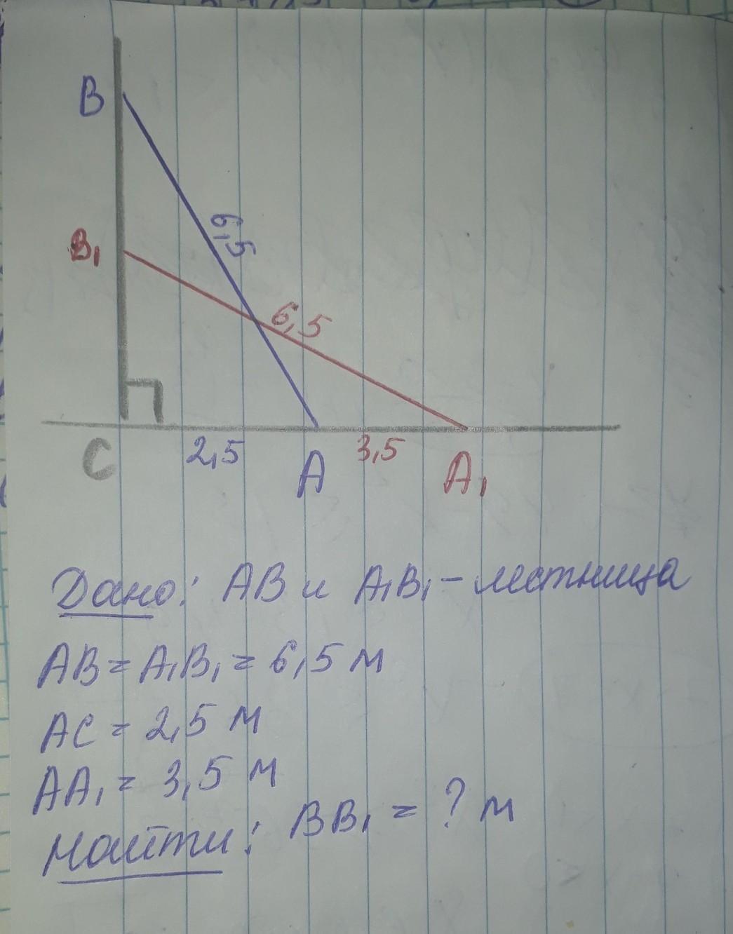 2) Лестница отодвинута от стены еще на 3,5 метра. Образуется новый треугольник А1B1C .Он также прямоугольный . Рассмотрим его стороны :