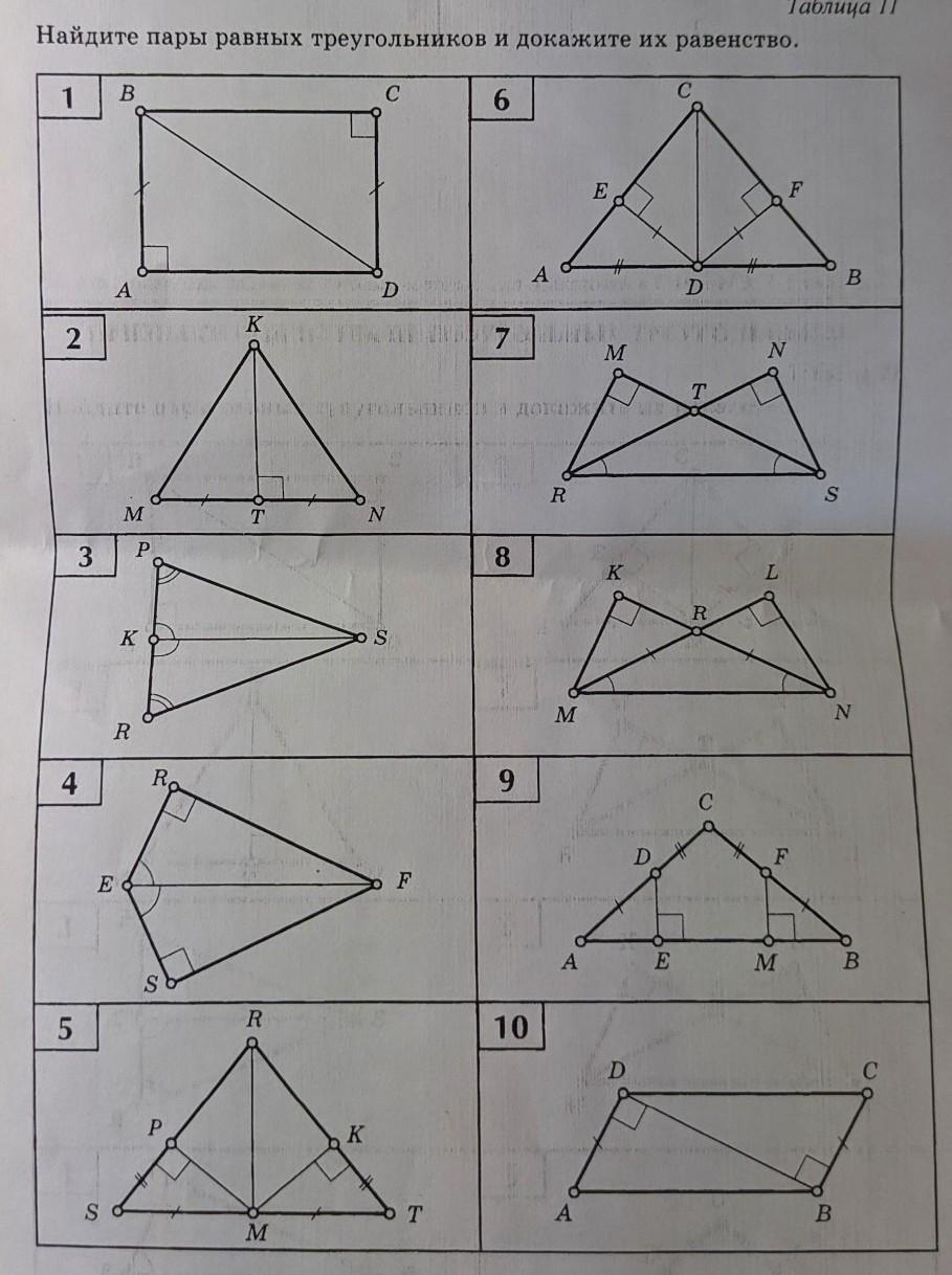 Помогите пожалуйста.Равенство прямоугольных треугольников. Найти пары равных треугольников и доказать их равенство