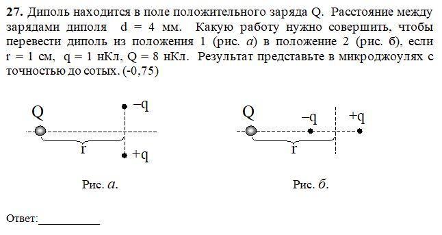 На рисунке б все немного сложнее. Отрицательный заряд находится на расстоянии r-0.5d=1-0.5*0.4=0.8 см или 0,008 м от заряда Q, а положительный на расстоянии 1+0,2=1,2 см или 0,012 м. С учетом этого можно записать