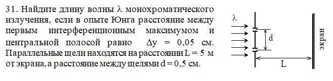 Найдите длину волны l монохроматического излучения, если в опыте Юнга расстояние между первым интерференционным максимумом и центральной полосой равно Dу = 0,05 см. Параллельные щели находятся на расстоянии L = 5 м от экрана, а расстояние между щелями d = 0,5 см.