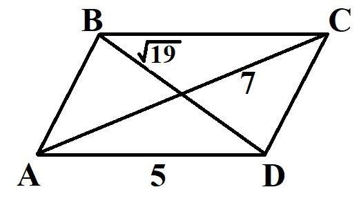 Длины диагоналей параллелограма равны 7 и (корень из 19), а длина одной из сторон равна 5. Найдите периметр параллелограма
