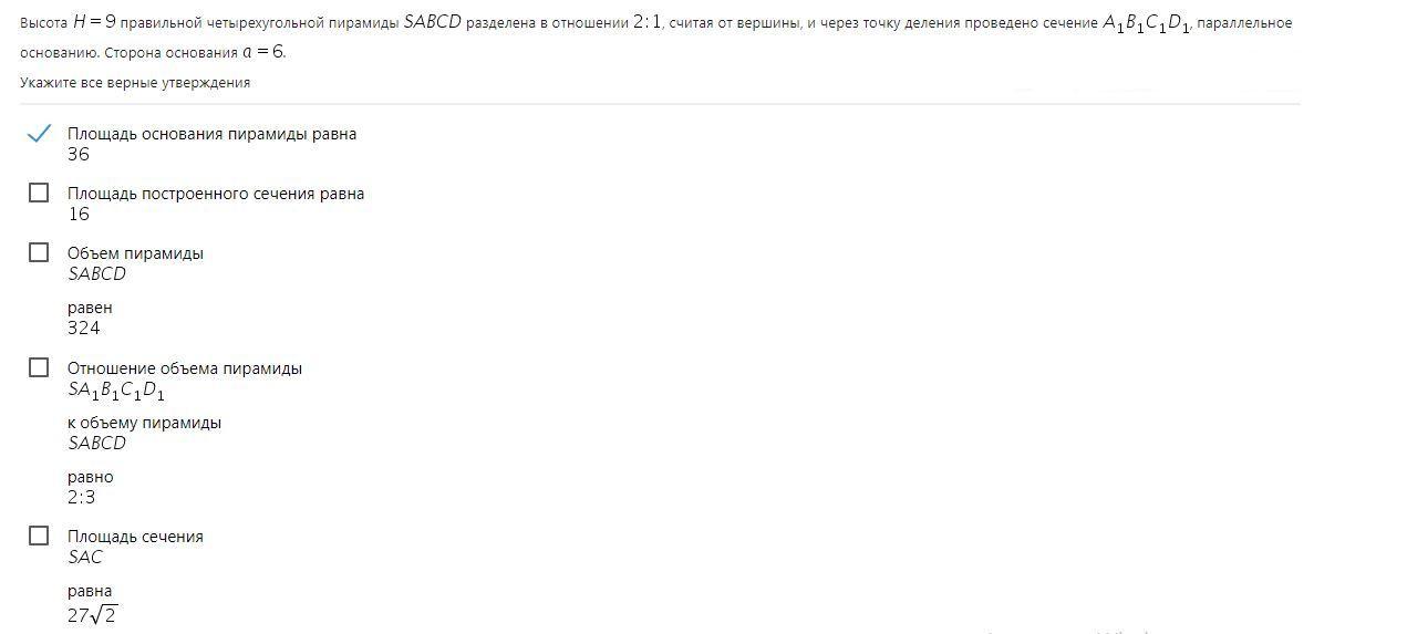 V( пирамиды S₁А₁В₁С₁D₁): V( пирамиды SАВСD)=32 :108=2²:3², это не равно 2:3