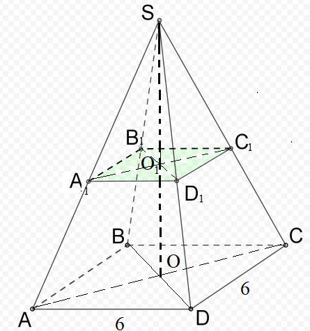 V( пирамиды S₁А₁В₁С₁D₁)=(1/3) S( A₁B₁C₁D₁)*H₁=(1/3)·16·6=32