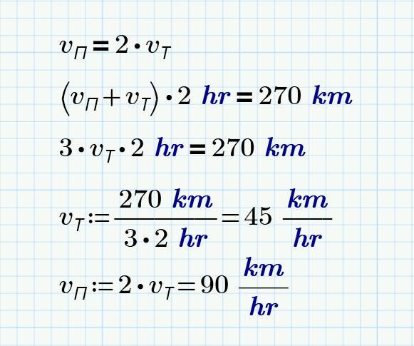 СРОЧНО!!! З пунктів А і Б одночасно назустріч один одному виїхали товарний і пасажирський потяги.Знайди швидкість кожного з них,якщо товарний рухався зі швидкістю,яка у два раза менша ніж швидкість пасажирського потяга, і зустрілися вони через 2 год, а відстань між пунктами А і Б 270км