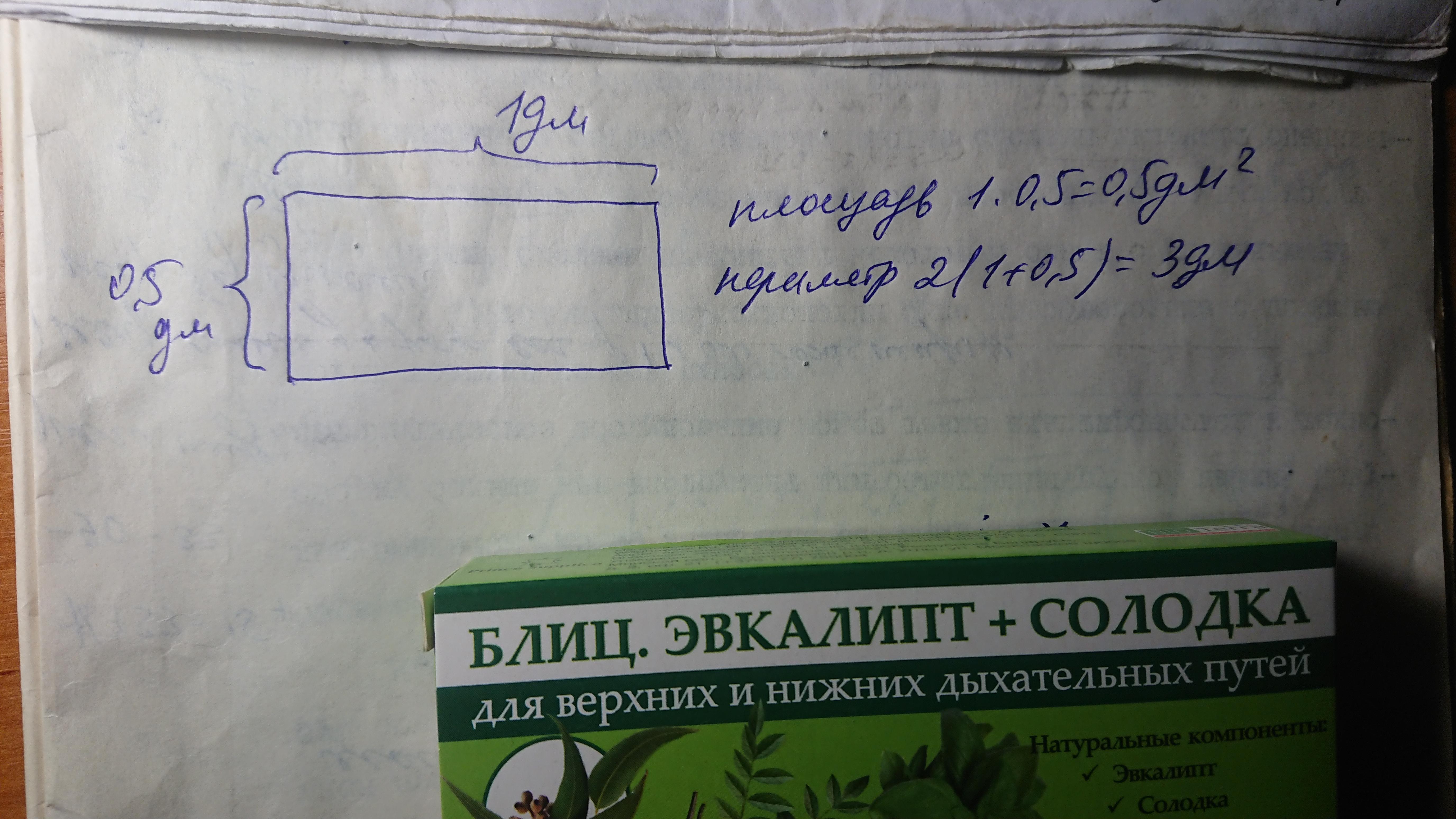 помогите решить.начертить прямоугольник.длинна которого 1 дм.а ширина в 2 раза меньше.вычисли периметр и площадь
