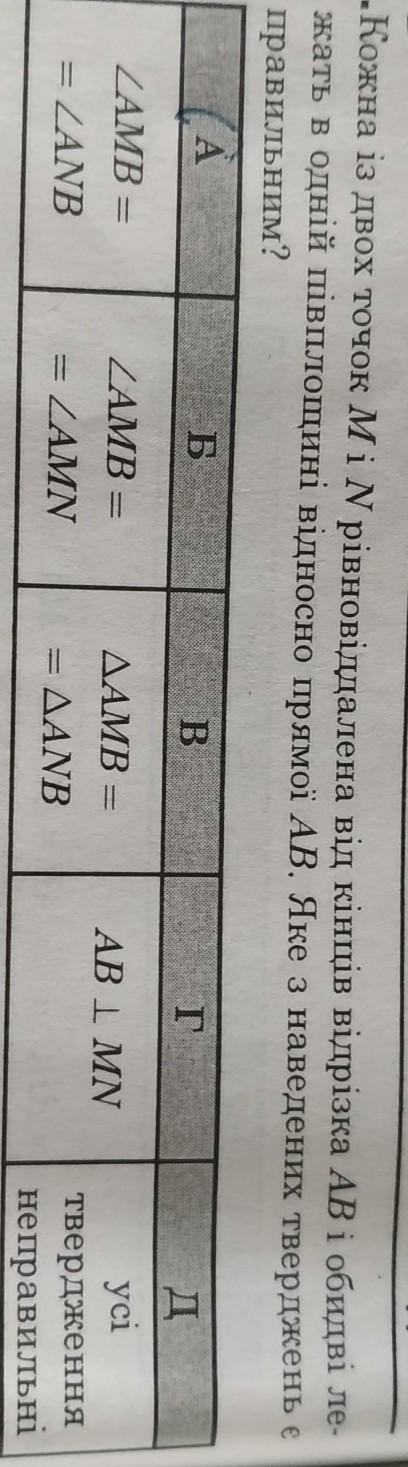 Кожна із двох точок M і N рівновіддалена від кінців відрізка AB і обидві лежать в одній півплощині відносно прямої AB. Яке з наведених тверджень є правильним?