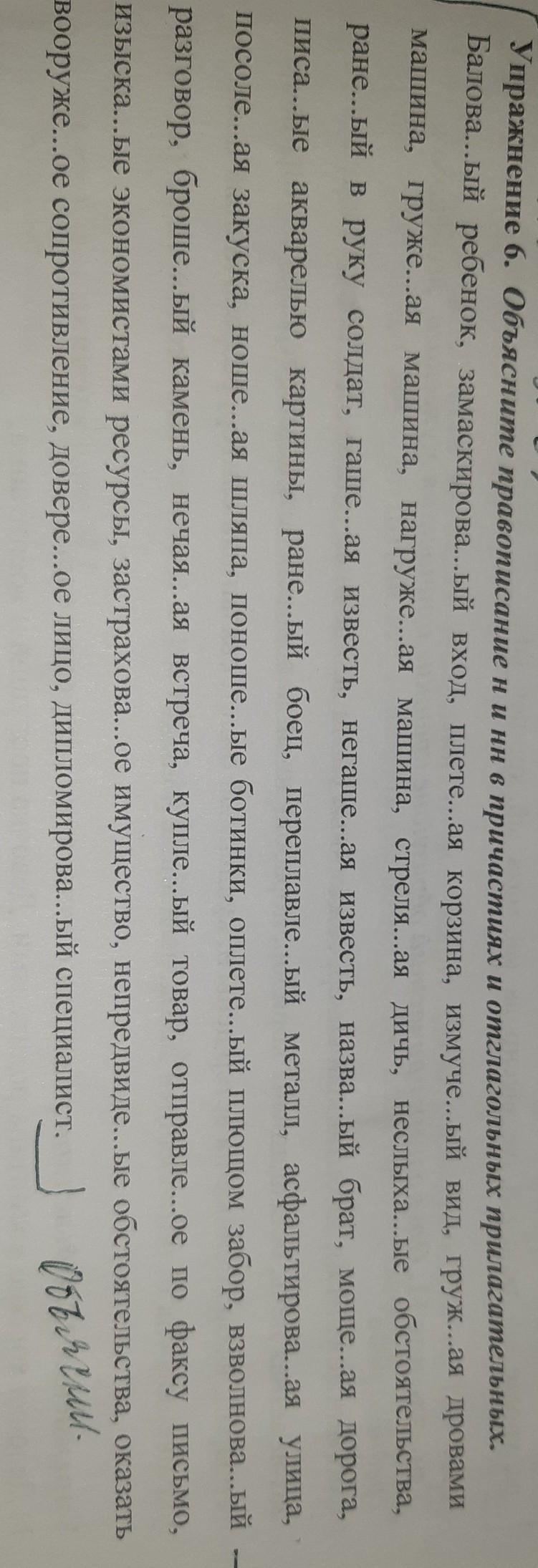 Балованный ребенок, замаскированный вход, плетеная корзина, измученный вид, груженная дровами машина, груженая машина, нагруженная машина, стреляная дичь, неслыханные обстоятельства, раненный в руку солдат, гашеная известь, негашеная известь, названый брат, мощеная дорога, писанные акварелью картины, раненый боец, переплавленный металл, асфальтированная улица, посоленная закуска, ношеная шляпа, поношенные ботинки, оплетенный плющом забор, взволнованный разговор, брошенный камень, нечаянная встреча, купленный товар, отправленное по факсу письмо, изысканные экономистами ресурсы, застрахованное имущество, непредвиденные обстоятельства, оказать вооруженное сопротивление, доверенное лицо, дипломированный специалист