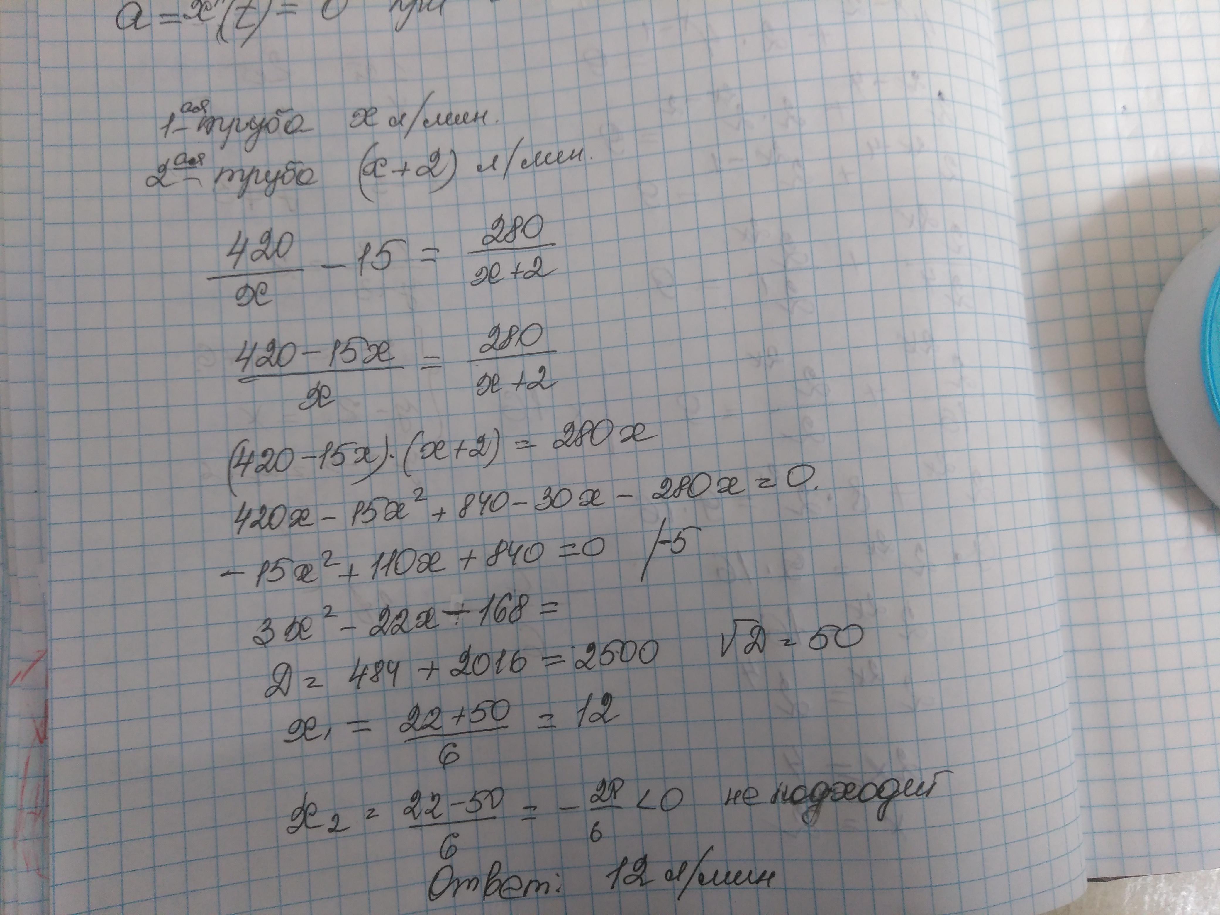 первая труба пропупускает на 2 литра в минуту меньше чем вторая. сколько литров воды в минуту пропускает первая труба , если ёмкость 420 литров она заполняет на 15 минут дольше , чем вторая заполняет емкость 280 литров?