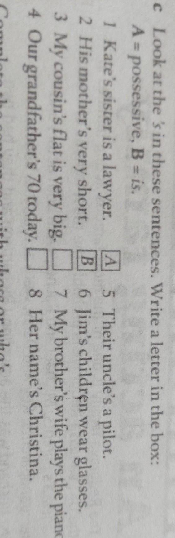 в первом случае под А, буква s означает принадлежность. Например, my brother's wife - жена моего брата. Что-то чьё-то)) а во втором случае, под B, буква 's это сокращенная IS (TO BE).