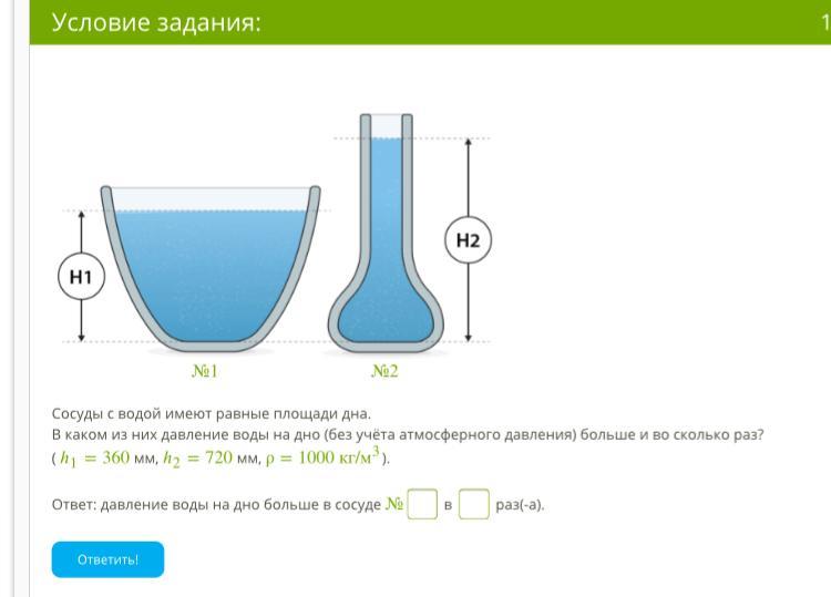 Ответ: давление воды на дно больше в сосуде №2 в 2 раз(-а).