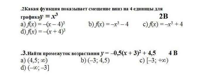 3. Графиком этой квадратичной функции служит парабола, ветви которой направлены вниз, т.к. первый коэффициент отрицат., он равен -0.5, вершина в точке (-3;4.5), поэтому промежуток возрастания d) (-∞;-3]