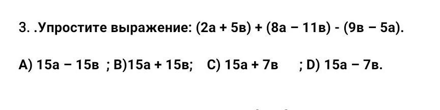 2а+5b+8a-11b-9b+5a=(2a+8a+5a)+(5b-11b-9b)=15a+(-15b)=15a-15b