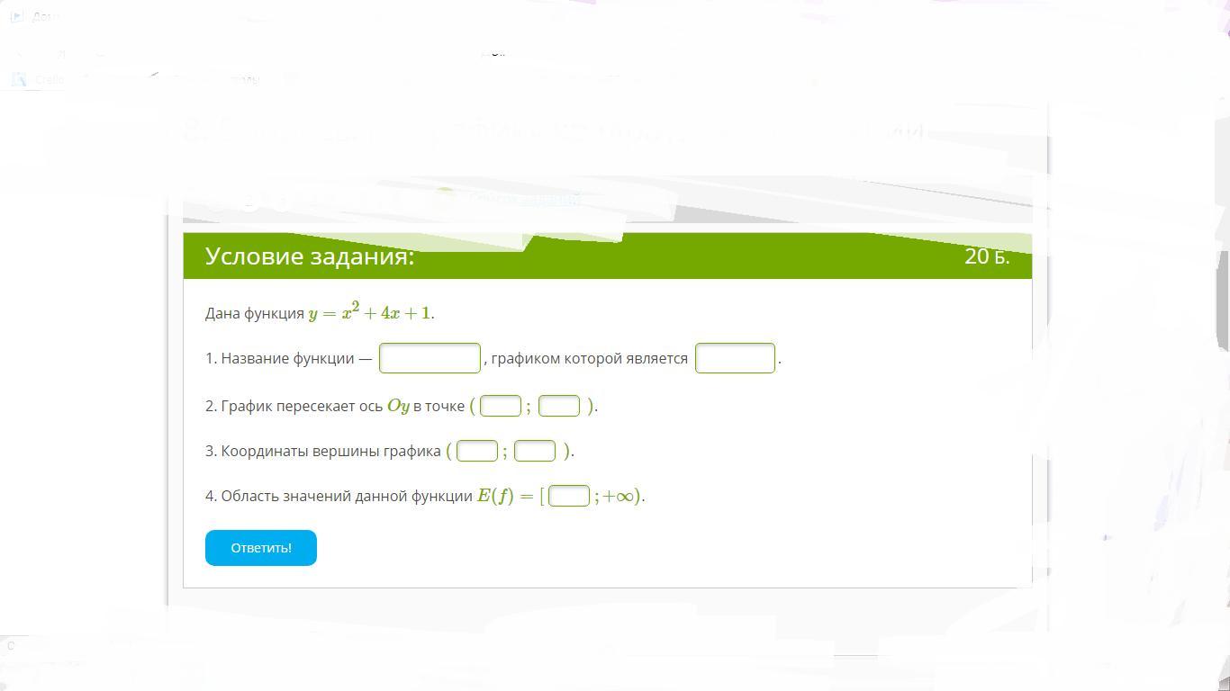 Дана функция y=x2+4x+1. 1. Название функции — , графиком которой является . 2. График пересекает ось Oy в точке ( ; ). 3. Координаты вершины графика ( ; ). 4. Область значений данной функции E(f)=[ ;+∞).